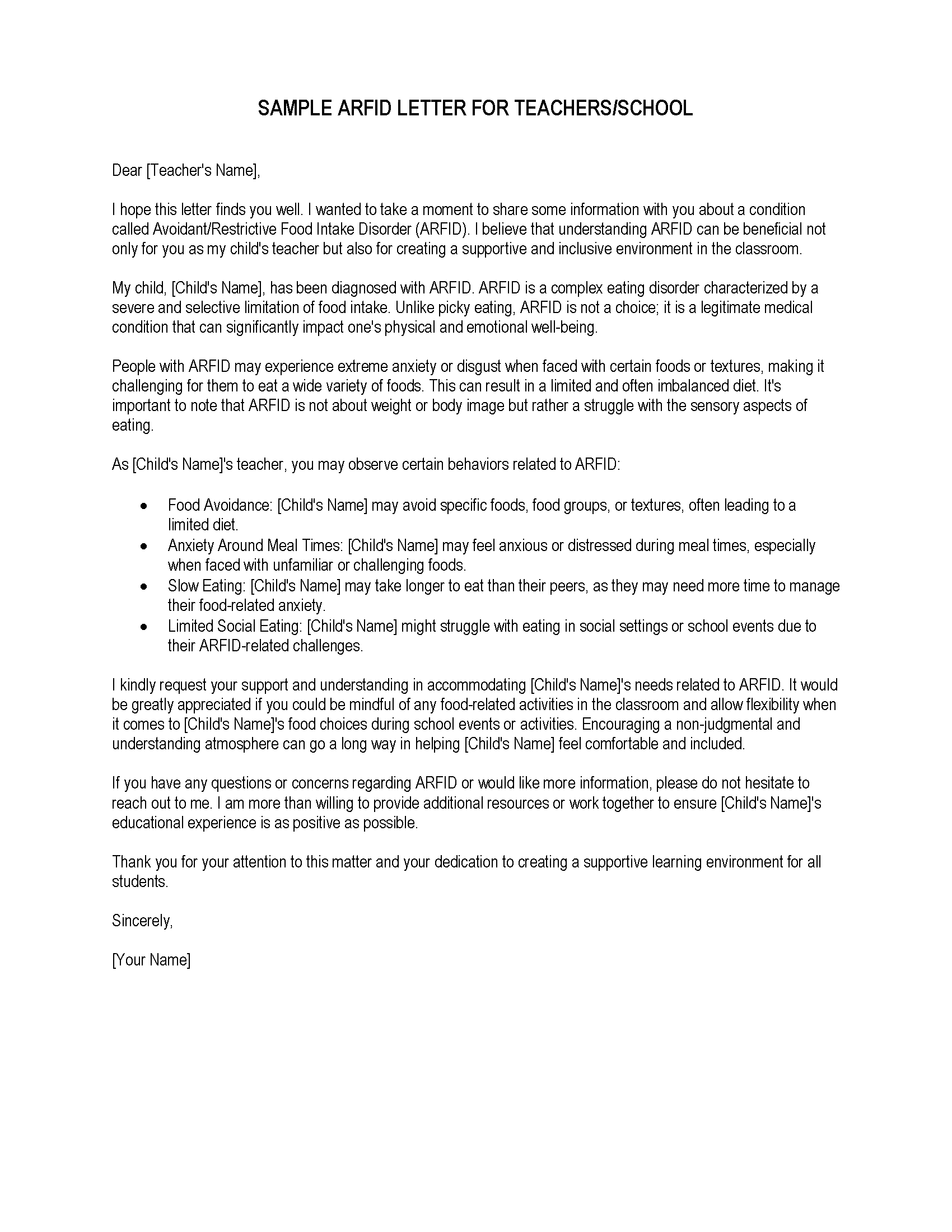 Sample Letter for Teachers/Schools explaining ARFID to help make your child's life easier at school/kinder. (Click the image to download an editable Word document)