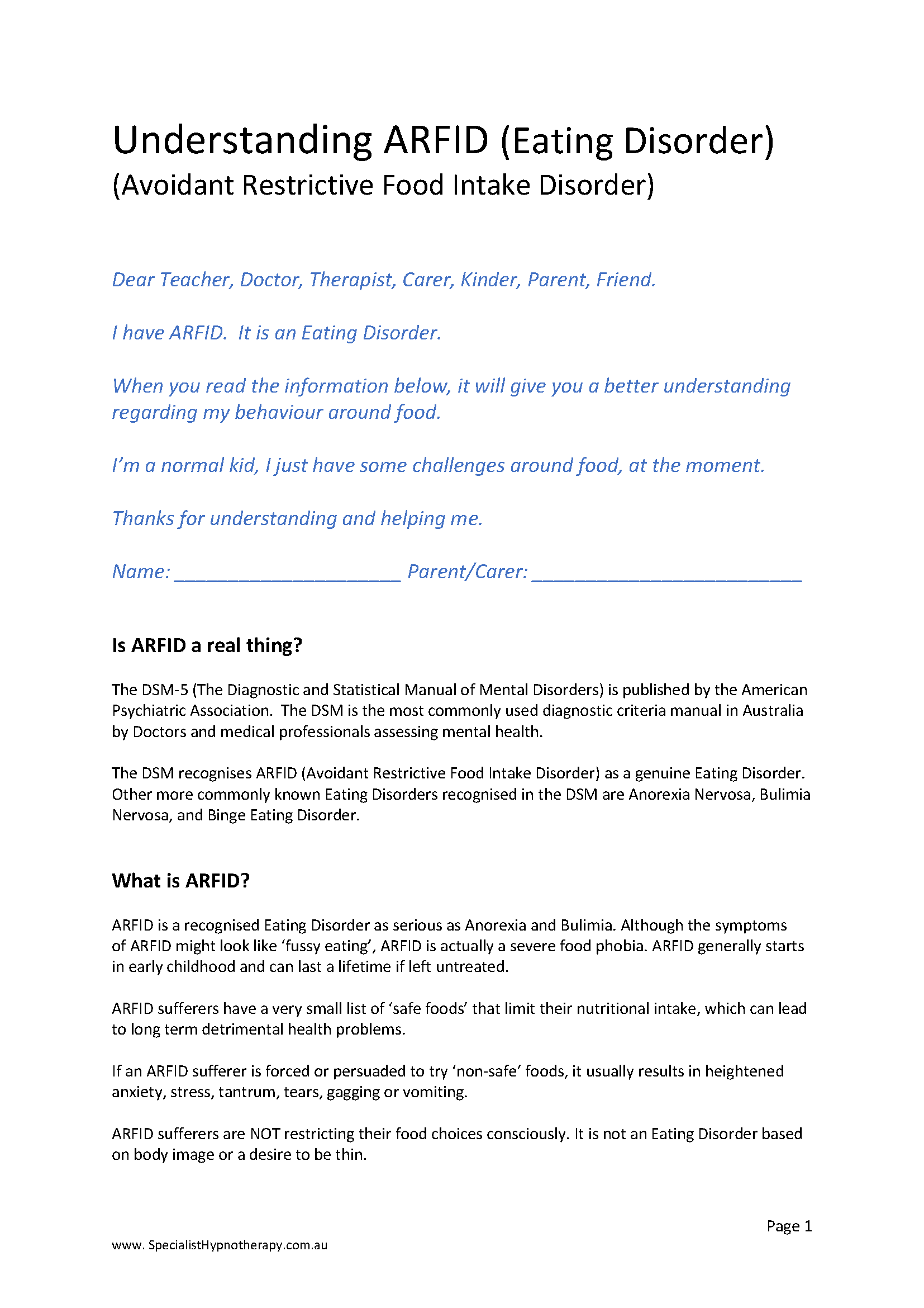 Sample friendly 2 page letter for School/Kinder explaining ARFID to teachers and staff. (Click the image to download an editable Word document)